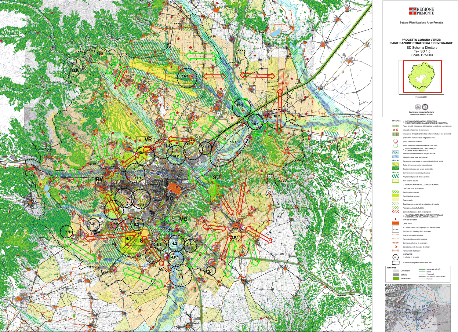 Schema Direttore Nello Schema direttore si propone una strategia integrata di riorganizzazione e riqualificazione dell’area torinese, che punta congiuntamente al riequilibrio ecologico (con la conservazione attiva degli spazi naturali e delle reti di connessione, la tutela del reticolo idrografico, la difesa dello spazio rurale come componente essenziale del quadro di vita della popolazione metropolitana) e alla valorizzazione del patrimonio storico-culturale, sia nelle sue espressioni di eccezionale valore che nei sistemi diffusi dei paesaggi culturali. Ribaltando l’approccio tradizionale, esso parte dagli spazi aperti, in particolare da ciò che resta della campagna periurbana, per proporre nuovi indirizzi urbanistici e infrastrutturali e nuove strategie di sviluppo sostenibile. Lo Schema direttore offre un vasto approfondimento interpretativo (sotto tre profili: ecologico, storico-culturale e paesistico-percettivo) ed un insieme organico di proposte strategiche, con scenari ed opzioni di fondo e linee di indirizzo (per l’area nel suo insieme e per ciascuno dei 17 “ambiti di aggregazione progettuale”). Nel suo insieme lo Schema direttore funge da quadro di riferimento per i processi di governance e i programmi d’intervento regionali ed è stato posto alla base del programma Corona Verde 2.