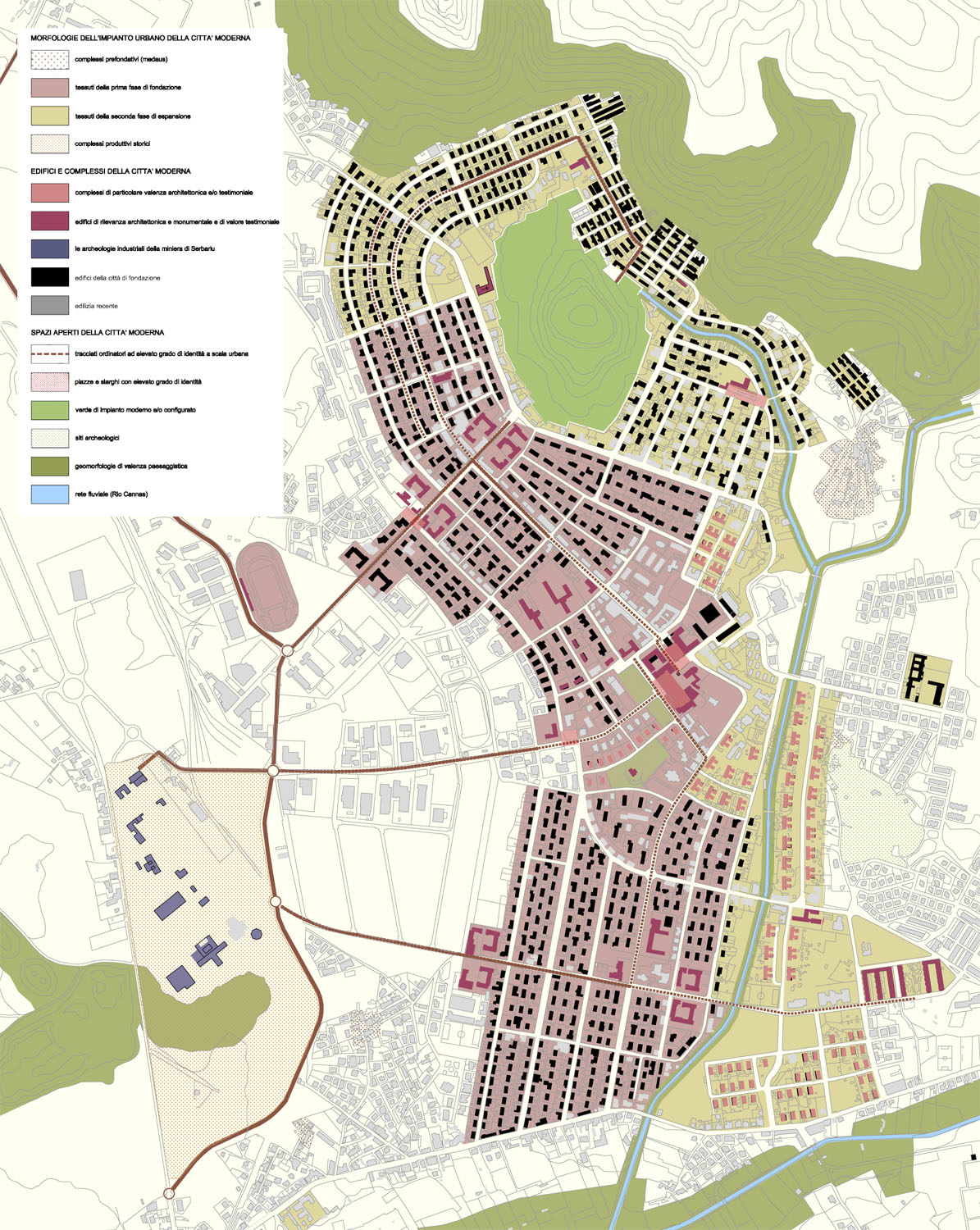 Per meglio delimitare la città-giardino sono stati definiti elementi di base come la creazione di una cintura verde che contiene una fascia di connessione infrastrutturale, «presidiata» dai grandi «monumenti civici» della città razionalista e dalla recuperata miniera di Serbariu.