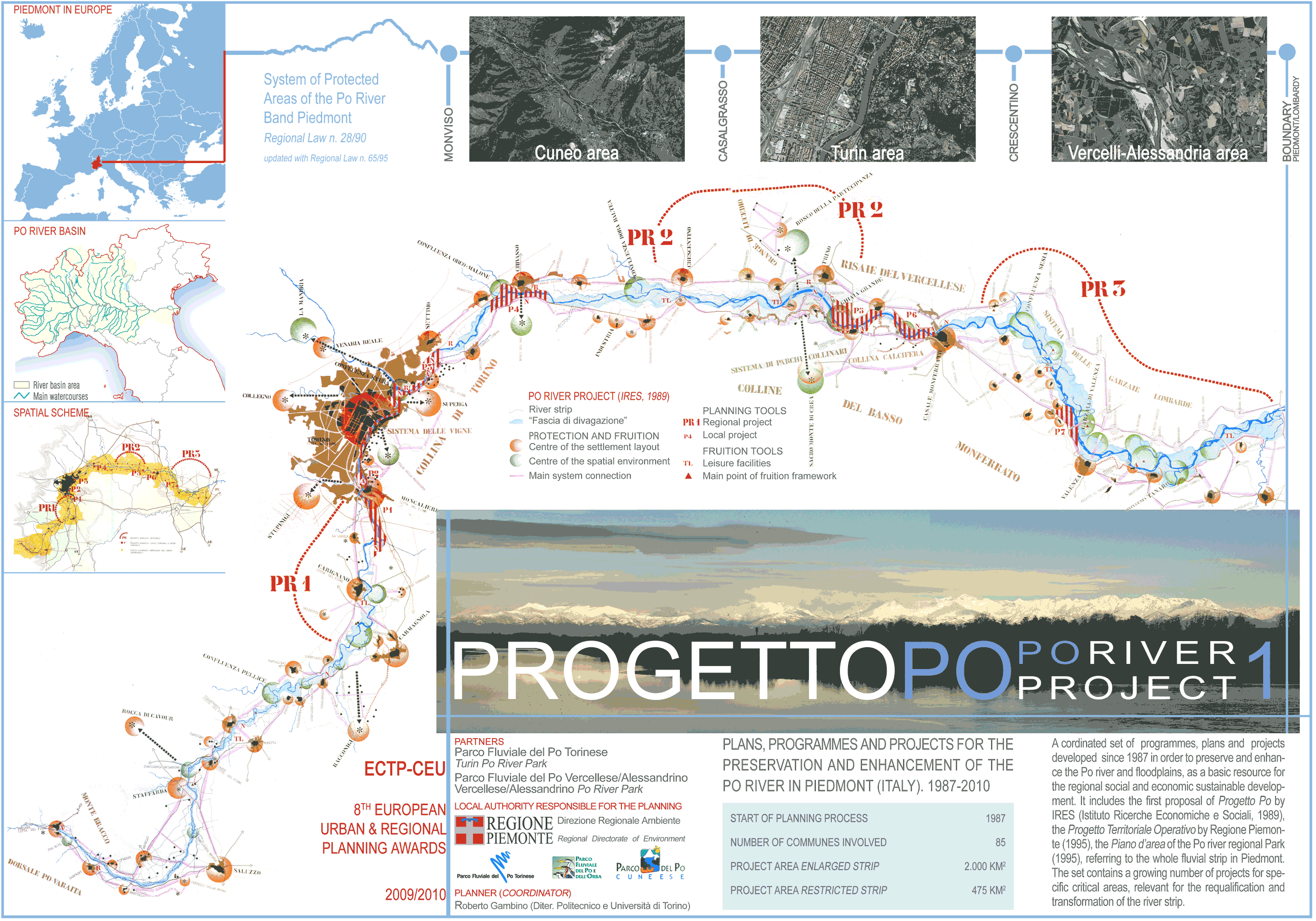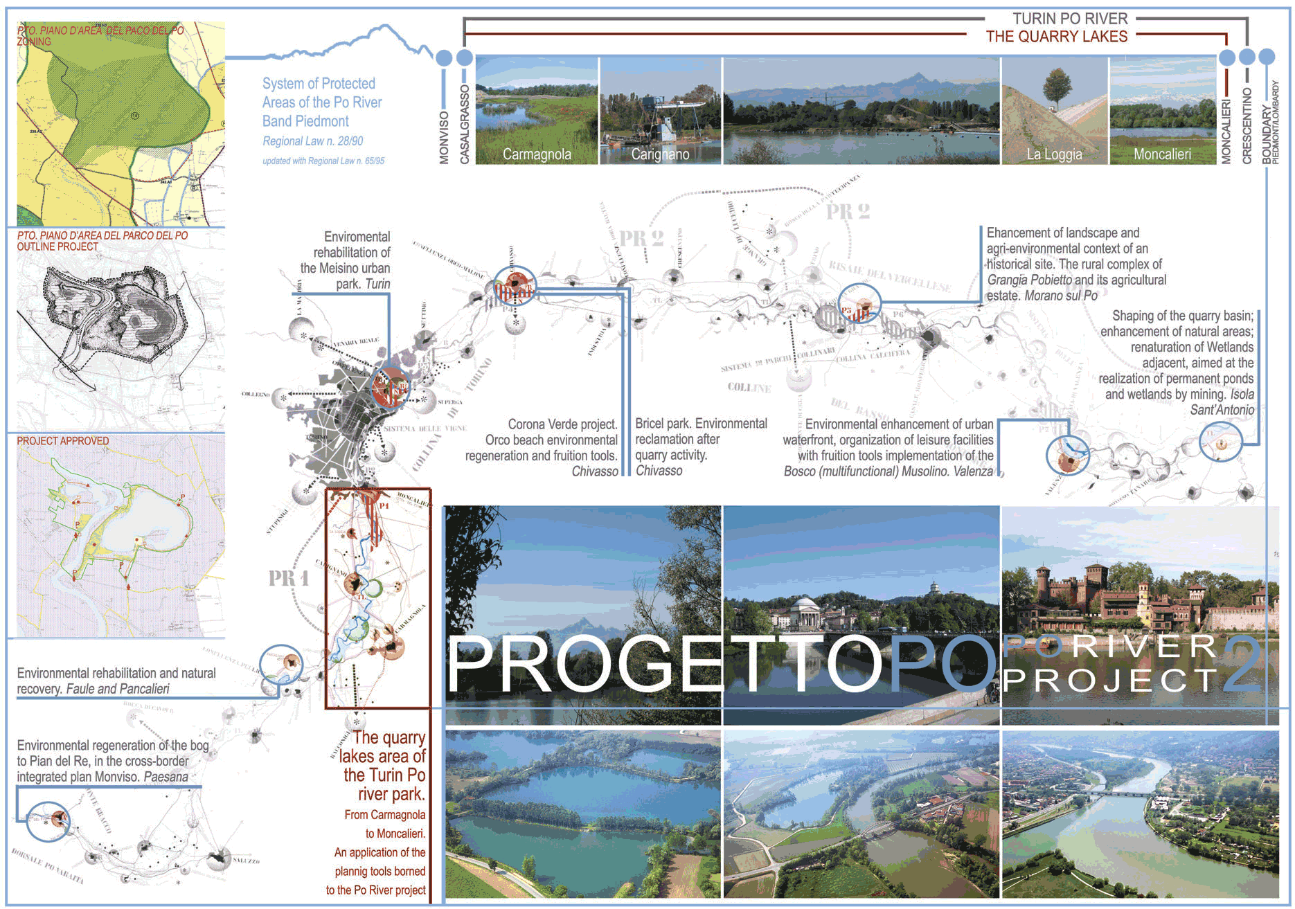 The title evokes a cordinated set of programmes, plans and projects developed since 1987 in order to preserve and enhance the Po river and floodplains, as a basic resource for the regional social and economic sustainable development. It includes he first proposal of “Progetto Po” by IRES (Istituto Ricerche Economiche e Sociali, 1989), the “Progetto Territoriale Operativo” by Regione Piemonte (PTO, 1995), the “Piano d’area” of the Po river regional Park (PdA, 1995), referring to the whole fluvial strip in Piedmont. The set also contains some projects for specific critical areas, relevant for the requalification and transformation of the river strip.
