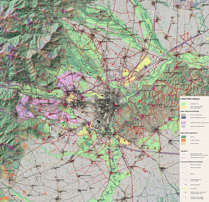 Le carte tematiche sono state predisposte originariamente per la redazione di tavole in scala 1:50.000 con le quali condurre le verifiche attraverso il confronto con i soggetti locali per approfondire i valori e i confini attribuiti agli ambiti di paesaggio percepito (circa 400).