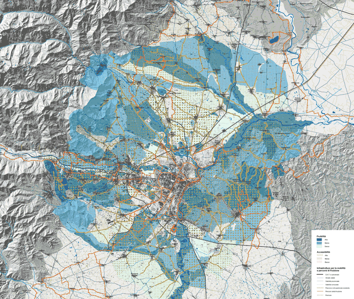 La fruibilità è funzione sia delle caratteristiche morfologiche del sito (massima per aree pianeggianti, più bassa in presenza di rilievi, ostacoli naturali o artificiali), sia della presenza di mete di interesse naturalistico o culturale, sia della collocazione strategica rispetto alle aree urbane. L’area è ricca, in ogni settore, di elementi di interesse; sono state considerate mete anche i paesaggi di ruralità integra.