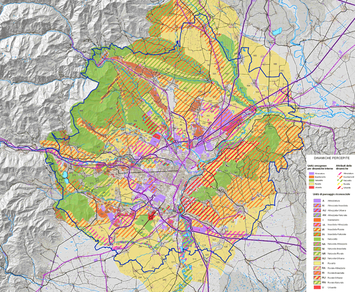 Lo studio si applica così al paesaggio delle trasformazioni tra rurale e urbano, con tutta la variegatura e le interferenze intermedie, assumendo che nella percezione del territorio, il paesaggio esterno è mondo rurale e il paesaggio interno è città: due assetti stabili, non più toccati dalle trasformazioni, sedi di altre identità.